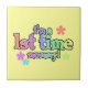 Bonito cor do arco-íris design de texto lê "Sou a primeira mamãe!" em tons de azul, rosa, verde, lilac e aqua em caixas de manutenção da Mamãe da Primeira Vez, azulejos, ornamentos, canecas, cartas, sacos de tote, botões, chaveiros e muito mais!