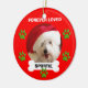 Este maravilhoso presente de Enfeites de natal de memorial para cães de estimação apresenta um fundo vermelho com um lugar para a foto do seu animal de estimação no centro. Abaixo da foto está um osso de cão que pode ser personalizado com o nome do seu pãozinho. As impressões verdes aparecem em volta da foto e as palavras "Forever Loved" aparecem acima dela. O verso pode ser personalizado com as datas. Além disso, aparecem as palavras "abençoado é a família que conheceu o amor de um cachorro maravilhoso". Este é um belo Enfeites de natal memorial para cães de estimação. Será um dos ornamentos mais queridos da sua árvore de Natal. Este ornamento também faz um belo presente de Natal para quem perdeu um cão este ano e manterá viva a memória de um animal de estimação. Copyright ornamanetsbyhenis