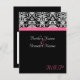 Cartão RSVP para combinar o nosso fundo negro Elegante com sotaque rosa quente fuchsia magenta, convite para casamento. Fundo preto fresco e elegante com destaque para damasco preto e branco e faixa de destaque horizontal colorida. Personalize online com seus detalhes de casamento.