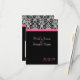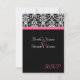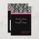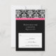 Cartão RSVP para combinar o nosso fundo negro Elegante com sotaque rosa quente fuchsia magenta, convite para casamento. Fundo preto fresco e elegante com destaque para damasco preto e branco e faixa de destaque horizontal colorida. Personalize online com seus detalhes de casamento.