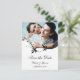 Elegante salve os cartões com fotos de data, com um design de rolagem floral preto e branco para enquadrar sua foto. Adicione sua própria foto e informações de casamento.