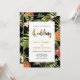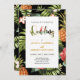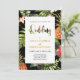 Este convite especial para casamento tropical apresenta um belo padrão tropical com tipografia de ouro.