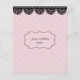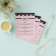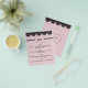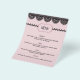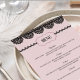 Crie um belo cardápio para comemorar seu dia especial. Estas simples folhas de papel pequenas têm um aspecto bonito e moderno. Este design apresenta as minhas ilustrações de rendas pretas colocadas sobre um fundo cor-de-rosa suave. Na frente, você pode personalizar os nomes de cursos e as descrições de comidas com seu próprio texto. No verso, você pode personalizar esses menus com o nome da noiva e noiva e a data do casamento.