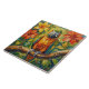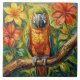 A sweet carminic tile with an impasto painting style parrot and colorful coral and yellow tropical flowers. Add a touch of a tropical paradise to your kitchen or bathroom backsplash or craft project.