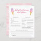 Previsões e cartões de conselhos sobre o chá de fraldas da menina do tema do sorvete divertido, apresentando uma ilustração do sorvete rosa e lavanda em um cone de waffle. Os textos são editáveis. Um jogo perfeito para jogar durante o chá e definitivamente será um excelente! O cartão aos hóspedes para predizer como o bebê se pareceria.