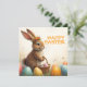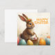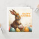 Um belo coelho da Páscoa com uma coroa de flores senta-se amorosamente em meio a ovos coloridos da Páscoa. Ele segura uma pequena cesta de vime com ovos pintados em suas patas. A cena é cercada por delicadas flores de primavera e luz quente. A inscrição "Felz pascoa" brilha acima do coelho em laranja alegre - uma saudação quente que captura a leveza e a alegria do festival do primavera.