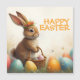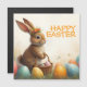 Um belo coelho da Páscoa com uma coroa de flores senta-se amorosamente em meio a ovos coloridos da Páscoa. Ele segura uma pequena cesta de vime com ovos pintados em suas patas. A cena é cercada por delicadas flores de primavera e luz quente. A inscrição "Felz pascoa" brilha acima do coelho em laranja alegre - uma saudação quente que captura a leveza e a alegria do festival do primavera.