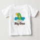 Prancha verde com listras e uma estrela amarela com um número um nele. Onda e areia do azul de turquesa em um dia ensolarado na praia. Apronte para grande na primeira roupa bonito do bebê do surf do aniversário, em favoritos para festas surfando do tema, em decorações do partido e em lembranças para o menino ou a menina que giram 1 ano velho. Presente bonito para a criança para um fã ou um surfista surfando.