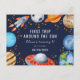 Primeira viagem ao redor do convite de festas de primeiro aniversario solar que pode ser personalizada com a inclusão dos detalhes e nome do seu aniversário. O design apresenta uma cena de espaço de aquarela fofa. O convite foi concebido tendo em mente um primeiro aniversario, mas a idade de aniversário pode ser editada de acordo com o mesmo.