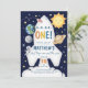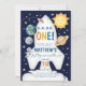 O convite para o primeiro aniversario externo apresenta planetas bonitos e estrelas. Essa design é ideal para alguém que tenha uma festa de aniversário temática Espaço.