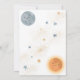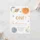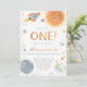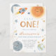 O convite apresenta design, sol, lua, foguete, estrelas e planeta Terra. Perfeito para um tema de primeiro aniversário.