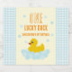 Um pato sortudo! Primeiro aniversário com pato de borracha e bolhas contra gingham azul claro e fundo amarelo pálido com texto laranja
