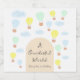 Um mundo maravilhoso! Primeiro aniversário com balões de ar quente verde, amarelo e azul claro ao lado de nuvens de aquarela.