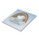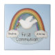 Azulejo para comemorar um primeiro comunhão santamente. O branco das características de design mergulhou com ramo de oliveira com arco-íris e nuvens. Personalize com nome e data. Faz uma lembrança bonita para um primeiro comunhão santamente.