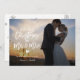 Cartão de férias moderno com as palavras "o nosso primeiro Natal como Sr. & Sra." em um moderno roteiro manuscrito com sua foto exibida atrás. A parte traseira da placa apresenta falso falso flocos de neve com brilho prateado.