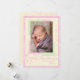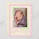 Mostre um retrato da sua adorável menina recém-nascida. Cartão de Natal colorido com borda rosa. A imagem é emoldurada por caixas verdes cor-de-rosa e pálidas. Corações e flocos de neve flutuam sob a foto. O texto diz "O Primeiro Natal do Bebê" e pode ser modificado. Personalize o texto com o nome do seu bebê e o ano. Fotografia © Storytree Studios, Stanford, CA