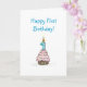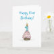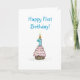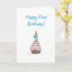Primeiro cartão religioso de aniversário. O primeiro cupcake de aniversário do bebê e o design original de arte da vela feitos a lápis e canetas coloridas. O texto azul na frente diz: "Feliz Primeiro Aniversário!" e o Deus dentro obrigado pela bênção de um ano de alegria com esta criança precioso.