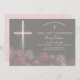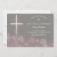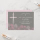 Esta elegante e bonito primeira carta de convite da comunhão apresenta uma cruz e ilustrada flor rosa margarida ao longo da parte inferior. A cor e o texto de fundo podem ser personalizados para o seu gosto pelo seu sacramento religioso especial.