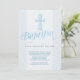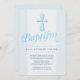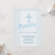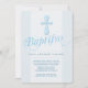 Um convite batismo azul e branco com cruz decorativa e a palavra batismo na caligrafia. (Pix). <br/>() O cartão é fácil de personalizar com seu texto, fonte, cor da fonte e escolha de seis tipos de papel.<br/>() Não exatamente o que você está procurando? Todos os nossos produtos podem ser personalizados para atender às suas necessidades sem custos adicionais.<br/>() Basta entrar em contato conosco em askcottonlamb@gmail.com<br/>() Coordenando os produtos disponíveis: