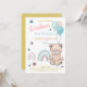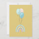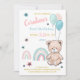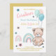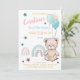 Os primeiros convites de aniversário são decorados com um ursinho fofo, balões e arco-íris.