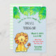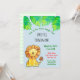 Convites personalizados. Ajuste o texto para torná-lo seu. A Mão Desenhada, ilustração adorável do leão da selva. Tema azul claro e branco, fundo listrado constituem esse design de aniversário fofo. Primeiro Aniversário. Tema da festa de aniversário da selva de leões.