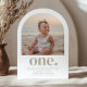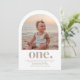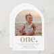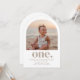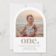 Um simples convite de Primeiro Aniversário com sua própria foto em forma de arco e as palavras 'um' embaixo.