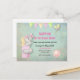 Um doce unicórnio bebê senta-se e olha para uma borboleta no nariz. Cartaz de convites bonito em tons de verde rosa e pálido para convidar seus convidados para a comemoração do seu aniversário. Personalize facilmente o texto em frente e atrás.