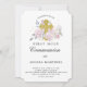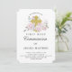 O convite muito bonito da Primeira Comunhão apresenta uma cruz de ouro rodeada por rosas rosas e folhas verdes de sábio. As fontes tradicionais dão a este convite uma aparência clássica.
