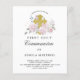 O convite muito bonito da Primeira Comunhão apresenta uma cruz de ouro rodeada por rosas rosas e folhas verdes de sábio. As fontes tradicionais dão a este convite uma aparência clássica.