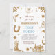 Celebre o dia especial do seu cowboy com este encantador convite do Primeiro Rodeio! Perfeito para um primeiro aniversario de festa com temas rodeados, este convite apresenta designs divertidos de inspiração ocidental e elementos brincalhões de caubói que dão o tom para uma celebração memorável. Fácil de personalizar com o nome, a data e os detalhes da festa do seu filho, este convite é obrigatório para os pais planejarem um aniversário encantador para o caubói. Vire-se e prepare-se para um dia de cheio de diversão, amigos e entusiasmo rodeio!