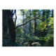 Brilhantes raios brancos do sol matinal, que passam por trás de galhos escuros para uma rica floresta verde de verão, com árvores maciças cobertas de mariposa e mato fértil.