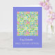 Um Cartão de Aniversário bonito de fevereiro para uma madrinha, com um padrão de primatas cor-de-rosa profundo, azuis profundos e amarelos, a Flor do Mês de Nascimento de fevereiro, de um design pintado à mão por Judy Adamson.