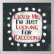 Um design de animais tipográficos irreverente que diz "Com licença, estou só à procura de guaxinins". Ele apresenta texto preto e vermelho em um retângulo branco com pontos brancos engraçados e brincalhões ao redor dele, tudo em um fundo de cinza.