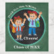 Um rótulo de vinho bonito com duas crianças de desenho animado em um quadro e fundo de quadro negro. Excelente a vinho depois de um ocupado ano escolar e um belo presente para um professor.