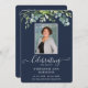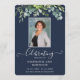 Personalize este programa simples e elegante com o nome, a foto e a mensagem do seu amado falecido. Honra e comemore a vida de seu amado com este modelo floral moderno, na moda, eucalipto em um clássico fundo azul. Fácil de personalizar texto e texto. As nossas sentidas condolências e orações estão convosco durante este período muito difícil.