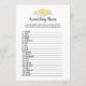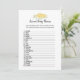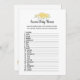 Um jogo divertido para a festa de revelação de gênero é o jogo de nomes de bebês de animais. Este cartão de jogo apresenta florais amarelos no topo. Ao contrário, está um ursinho de pelúcia que se inclina sobre um barril de mel observando uma abelha de mel com modelos.