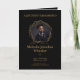 Programa de memorial bifold preto elegante com texto quente em Honey‑Brown, uma foto, obituário, ordem de serviço, escritura e poema.