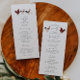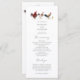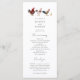 Programa de casamento russo com ilustração aquosa de galinhas. As informações da cerimônia de núpcias e os nomes das festas de casamento estão listados neste programa.