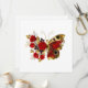 Borboleta de flores de olhos vermelhos, de cor pavão, com asa vermelha texturizada, decorada com a composição de rosas vermelhos pintados artisticamente com caules ouros e folhas sobre fundo branco.