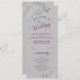 Este belo programa de casamento apresenta um elegante design com o roxo do chassis ou texto magenta sobre um fundo de cinza e caramujos de folha fina de cinza prateada e espirais nos cantos. Os títulos são escritos em caligrafia com script de rico, e há espaço para os detalhes da sua cerimônia e festa de casamento, assim como um obrigado curto para o seu convidado. É uma maneira maravilhosa de dar as boas-vindas aos seus amigos e familiares à sua celebração de casamento.