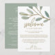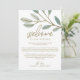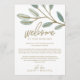 Esses cartões de boas-vindas e itinerário de casamento com eucalipto dourado são perfeitos para um casamento elegante. O design simples e delicado apresenta uma camada de brilho dourado falso nos ramos de folhas verde-oliva. A frente do cartão apresenta uma carta de boas-vindas e o verso apresenta o itinerário do casamento. Essas notas são perfeitas para casamentos em destino e bolsas de boas-vindas para hóspedes de hotéis.
