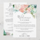 Essas cartas de boas-vindas e itinerário com peônias românticas são perfeitas para um casamento elegante. O design floral apresenta flores em aquarela em tons de rosa claro, pêssego e branco. A frente do cartão apresenta uma carta de boas-vindas e o verso apresenta o itinerário do casamento. Essas notas são perfeitas para casamentos de destino e sacolas de boas-vindas para hóspedes de hotéis.