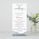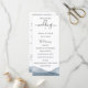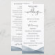Bordas elegantes e modernas em aquarela azul dip dye, programa de casamento. Programa apresenta acento de caligrafia fofa "casamento" com várias linhas para listas de texto personalizadas para ordem dos eventos da cerimônia, festa de casamento e nota de agradecimento.