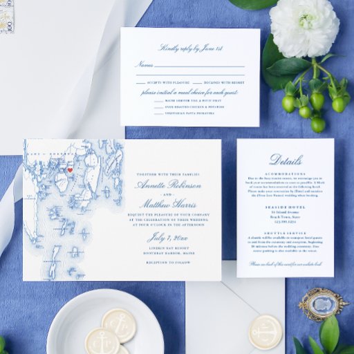 Guie convidados através do seu casamento costeiro em Maine com este elegante programa temático azul de Boothbay Harbor, ideal para uma cerimônia em Linekin Bay Resort. Apresentando um mapa lindamente detalhado, este programa traça cada momento especial, dando aos hóspedes uma atenção cuidadosa e uma visão clara dos acontecimentos do dia. É o toque perfeito para uma celebração memorável à beira-mar. Trabalho de arte por Designs de Mapa Costeiro.