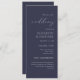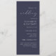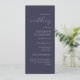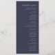 Este programa de casamento simples e elegante apresenta texto branco alinhado com a margem direita em um fundo azul escuro de marinho. A palavra "casamento" aparece em caligrafia branca, com o texto restante em fontes serif e itálicas.