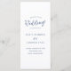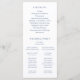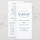 Programa de casamento de estilo clássico com um design simples e um toque moderno. As palavras de destaque estão em uma elegante letra cursiva e os nomes da noiva e do noivo estão em uma fonte serifada tradicional. A cor é azul poeirento e pode ser alterada para qualquer cor desejada na ferramenta de edição de design. O layout minimalista deste programa o torna ótimo para um casamento formal.