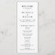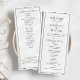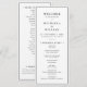 Este modelo de programa de casamento simples e elegante em preto e branco apresenta um design minimalista atemporal com tipografia serifada nítida e espaçamento refinado, criando um layout sofisticado que guia os convidados pelos detalhes da cerimônia e recepção. A frente apresenta uma mensagem de boas-vindas formal com os nomes do casal, data do casamento, local e uma lista de membros da festa de casamento claramente organizada, enquanto o verso oferece uma ordem de eventos simplificada, desde a cerimônia até a despedida, seguida por uma nota de agradecimento sincero ou qualquer outro texto de sua escolha. A paleta de cores monocromática limpa e o formato estruturado tornam-no versátil para qualquer tema de casamento, mantendo um visual polido e sofisticado perfeito para celebrações clássicas, modernas ou formais.