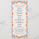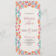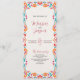 Este design do Programa de Casamento Floral Tradicional de Arte Folclórica Mexicana de Fiesta apresenta uma vibrante borda floral que enquadra um fundo texturizado fora do branco, criando uma aparência festiva e convidativa. A borda apresenta um arranjo simétrico de flores laranja, vermelhas, rosa e azuis, acentuadas com flores borbulhantes e laranja, pontos brincalhões e elementos folhosos. O centro é vazio esquerdo, oferecendo amplo espaço para texto personalizado enquanto é elegantemente fechado por padrões animados e inspirados na arte popular.