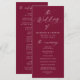 Este elegante programa de casamento mostra a frase "O Casamento de" em lindas caligrafias brancas contra um rico fundo burgundy, exuando sofisticação e estilo. Personalize-o com seus nomes, data de casamento e detalhes da cerimônia em letras brancas em negrito para um toque impressionante e personalizado. O lado inverso inclui os nomes do seu partido noivo, fazer-o como um perfeito guardião para os seus convidados. Com sua design moderna, simples e elegante, este programa de casamento é ideal para casamentos formais e casuais em qualquer estação, complementando lindamente o tema do seu casamento e aprimorando a ambição de sua cerimônia.