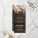 Flores de lavanda roxas de aquarela roxas e decoração verde estes programas de casamento rústicos. Design apresenta flores com luzes de cordas e um fundo de madeira de celeiro escuro com uma fonte moderna.